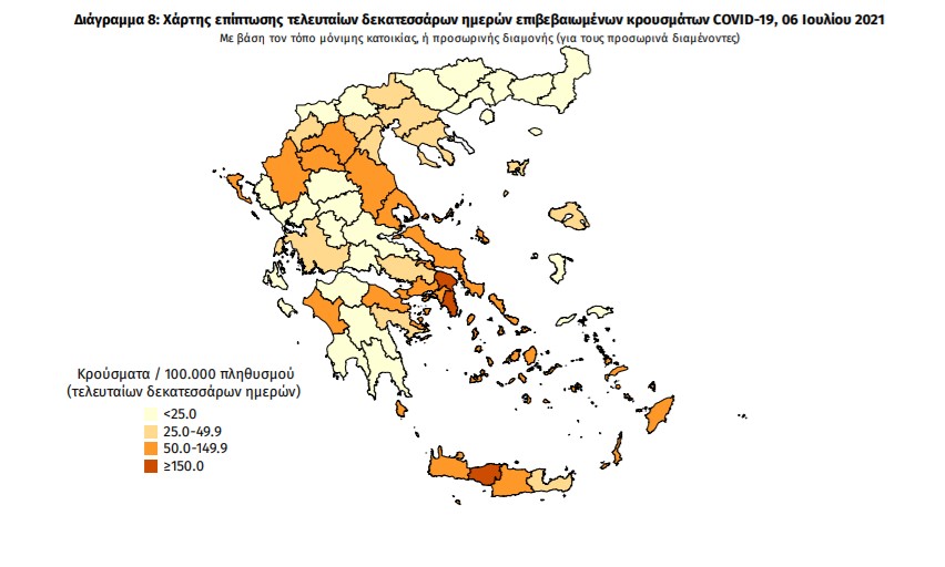 Με βάση τα επιβεβαιωμένα κρούσματα των τελευταίων 7 ημερών, 125 θεωρούνται σχετιζόμενα με ταξίδι από το εξωτερικό και 1.446 είναι σχετιζόμενα με ήδη γνωστό κρούσμα.