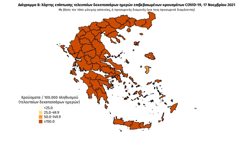 Οι νέοι θάνατοι ασθενών με COVID-19 είναι 87, ενώ από την έναρξη της επιδημίας έχουν καταγραφεί συνολικά 17.012 θάνατοι. Το 95.3% είχε υποκείμενο νόσημα ή/και ηλικία 70 ετών και άνω.
