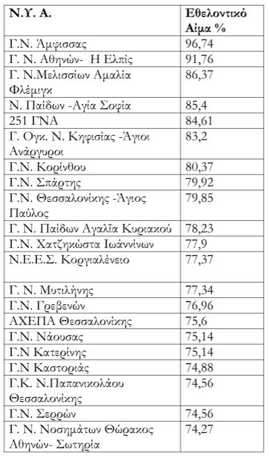 Όπως επισημαίνει το ΕΚΕΑ, οι Νοσοκομειακές Υπηρεσίες Αιμοδοσίας της χώρας συμβάλλουν και προσπαθούν για την εξασφάλιση επάρκειας αίματος. Σε αυτή την προσπάθεια, κάποιες, για διαφόρους λόγους, έχουν καλύτερες επιδόσεις. Πάντως, στα 15 καλύτερα νοσοκομεία, με κριτήριο τον αριθμό των μονάδων αίματος που συλλέγουν, δεν είναι κανένα από την Περιφέρεια Πελοποννήσου. Με κριτήριο, ωστόσο, το ποσοστό του εθελοντικού αίματος που συλλέγουν, μεταξύ των 20 νοσοκομείων με τις καλύτερες επιδόσεις είναι αυτά της Κορίνθου, που καταλαμβάνει την 7η θέση πανελλαδικά με ποσοστό 80,37% και της Σπάρτης, που καταλαμβάνει την 8η θέση πανελλαδικά με ποσοστό 79,92% - ενώ ο μέσος όρος της χώρας είναι 65,34%.