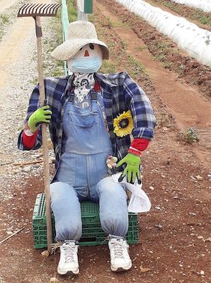 Ενα τέτοιο σκιάχτρο, που πραγματικά είναι έργο τέχνης, βρίσκεται στην άκρη αγροκτήματος στην εθνική οδό Κυπαρισσίας – Φιλιατρών, στο ύψος της διασταύρωσης της Φαρακλάδας. Πέρα από την... κλασική αμφίεσή του, φορά και μάσκα, ώστε να βρίσκεται μέσα στο κλίμα της εποχής.