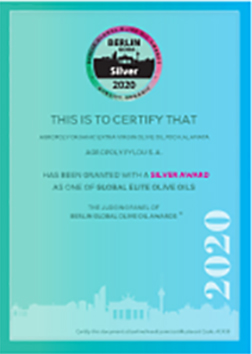 - ΑΣΗΜΕΝΙΟ στο διαγωνισμό του Βερολίνου στη Γερμανία «BERLIN GLOBAL OLIVE OIL AWARDS» μια σημαντική διάκριση ανάμεσα σε χιλιάδες άλλα απ’ όλο τον κόσμο, ως ένα από τα ποιοτικότερα ελαιόλαδα παγκοσμίως.