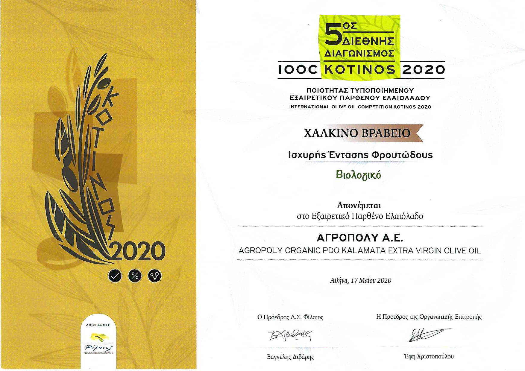 - ΧΑΛΚΙΝΟ στον 5ο ΔΙΕΘΝΗ ΔΙΑΓΩΝΙΣΜΟ IOOC «KOTINOS 2020» ανάμεσα σε εκατοντάδες άλλα ελαιόλαδα.