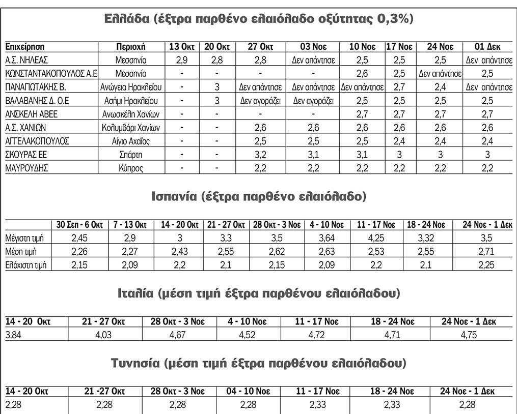 Η τιμή του έξτρα παρθένου ελαιόλαδου στην Ελλάδα κυμαίνεται από 2,4 έως 3 ευρώ το κιλό, στην Ισπανία από 2,25 έως 3,5 ευρώ, στην Ιταλία από 4 έως 6,2 ευρώ, ενώ στην Τυνησία η μέση τιμή ξανάπεσε ελαφρώς, στα στα 2,28 ευρώ το κιλό.