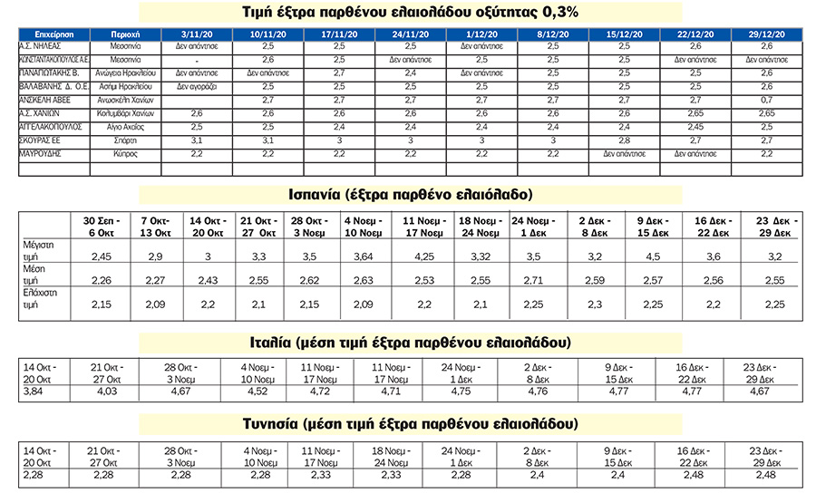 Στην υπόλοιπη Ελλάδα οι τιμές κυμαίνονται μεταξύ 2,5 και 2,7 ευρώ το κιλό, στην Ισπανία μεταξύ 2,25 και 3,2 ευρώ το κιλό, στην Ιταλία μεταξύ 4,2 και 6,2 ευρώ το κιλό, ενώ στην Τυνησία η μέση τιμή διαμορφώθηκε στα 2,48 ευρώ το κιλό.