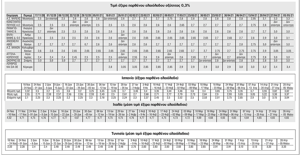 Στην υπόλοιπη Ελλάδα η τιμή του έξτρα παρθένου ελαιόλαδου κινείται σταθερά πάνω από 3 ευρώ το κιλό. Στην Ισπανία η μέση τιμή του ίδιου προιόντος έχει διαμορφωθεί στα 3,37 ευρώ το κιλό, στην Τυνησία στα 3,33 ευρώ και στην Ιταλία στα 4,65 ευρώ το κιλό.