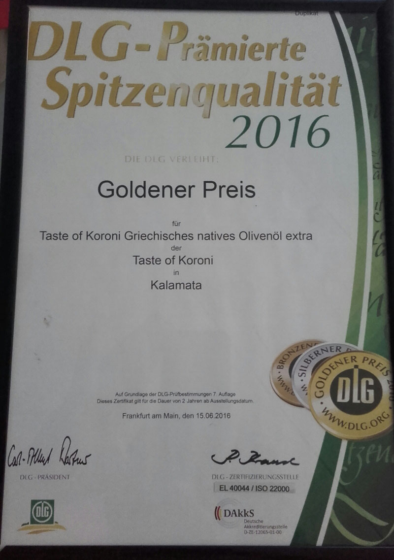 Το Taste of Koroni συμμετείχε στον διαγωνισμό ελαιόλαδου του γερμανικού Οργανισμού DLG (Deutsche Landwirtschafts-Gesellschaft – German Agricultural Society) στην Φρανκφούρτη της Γερμανίας και κατάφερε να διακριθεί ανάμεσα σε 203 ελαιόλαδα από όλο τον κόσμο, κερδίζοντας το χρυσό βραβείο. Οπως τόνισε μιλώντας στην "Ε" ο Στέφανος Μανωλέας, το ελαιόλαδο αυτό παράγεται και τυποποιείται στην Μεθώνη στις ιδιόκτητες εγκαταστάσεις του οικογενειακού τυποποιητηρίου. Το μυστικό δε της κορυφαίας ποιότητάς του είναι ότι την ίδια ημέρα, με το που μαζεύεται η ελιά, δεν θα μείνει στα σακιά και μέχρι το βράδυ θα έχει βγει το λάδι στο τοπικό ελαιοτριβείο και θα τυποποιηθεί αμέσως. Αξίζει να σημειωθεί ότι η συνεργασία του Γερμανού επιχειρηματία με το οικογενειακό συσκευαστήριο στη Μεθώνη ξεκίνησε στο τέλος της περσινής χρονιάς. Η οικογένεια Μανωλέα ήταν μάλιστα αυτή που ώθησε τον Γερμανό επιχειρηματία να συμμετάσχει στο διαγωνισμό τον περασμένο Ιούνιο, αποκτώντας και οι ίδιοι ένα αντίτυπο του χρυσού βραβείου.
