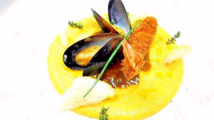 Φάβα με παναρισμένες κόκκινες Γαρίδες Μεσσηνίας σε κανταΐφι και μύδια αχνιστά