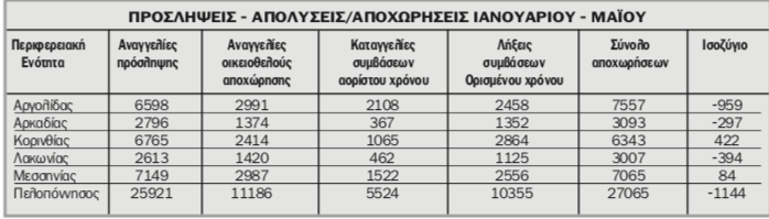 Αναλυτικά το ισοζύγιο εργασίας στις πέντε ενότητες της Περιφέρειας Πελοποννήσου παρουσιάζεται στον πίνακα.