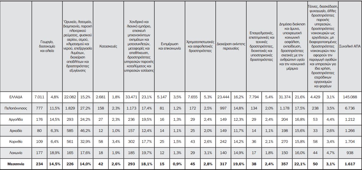 Αναλυτικά τα στοιχεία για την ΑΠΑ σε εκατομμύρια ευρώ στις ενότητες της Πελοποννήσου και στην Ελλάδα παρουσιάζονται στον πίνακα: