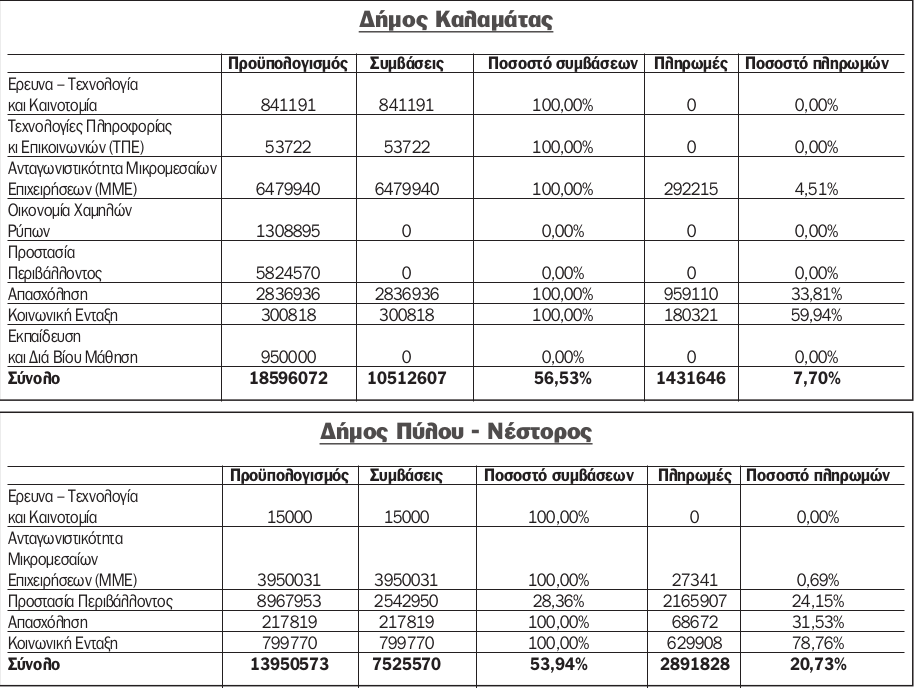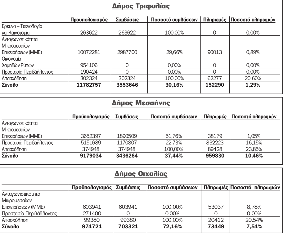 Πολύ χαμηλή απορρόφηση πόρων 1,29% έχει και ο Δήμος Τριφυλίας, ενώ και στο Δήμο Καλαμάτας η απορρόφηση δεν ξεπερνά το 7,70%.