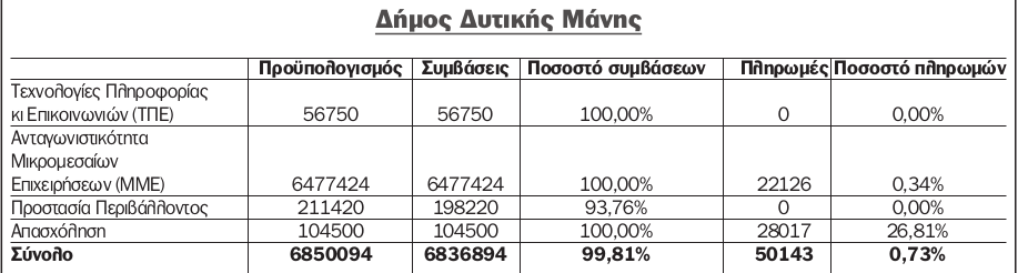 Ειδικά στο Δήμο Μάνης, ενώ έχουν υπογραφτεί συμβάσεις για το 99,8% των έργων, έχει απορροφηθεί μόλις το 0,73%. Αξίζει να σημειωθεί ότι οι περισσότερες χρηματοδοτήσεις στο Δήμο Μάνης αφορούν την ενίσχυση της ανταγωνιστικότητας των επιχειρήσεων.