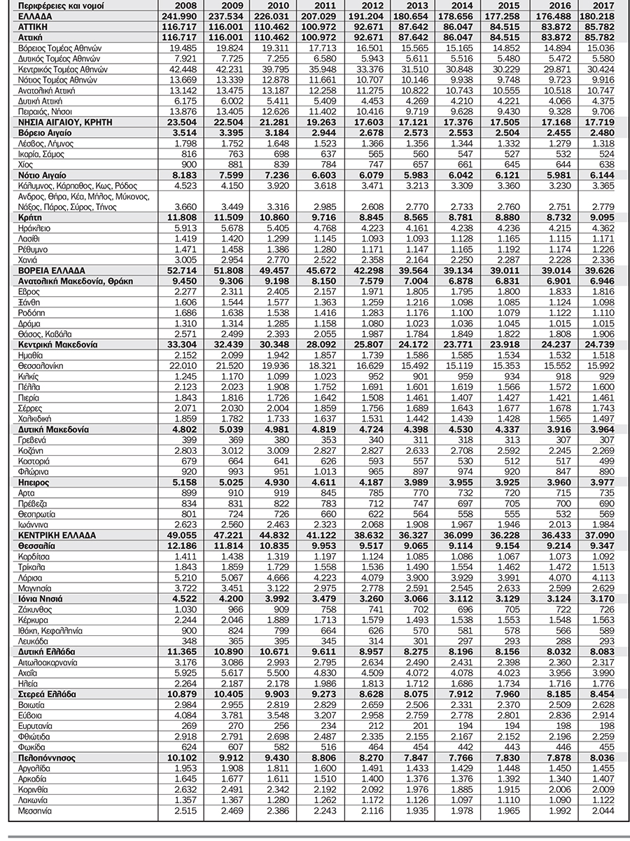 Αναλυτικά τα στοιχεία του ΑΕΠ της δεκαετίας 2008-2017κατά περιφέρεια και νομό παρουσιάζονται στον Πίνακα.