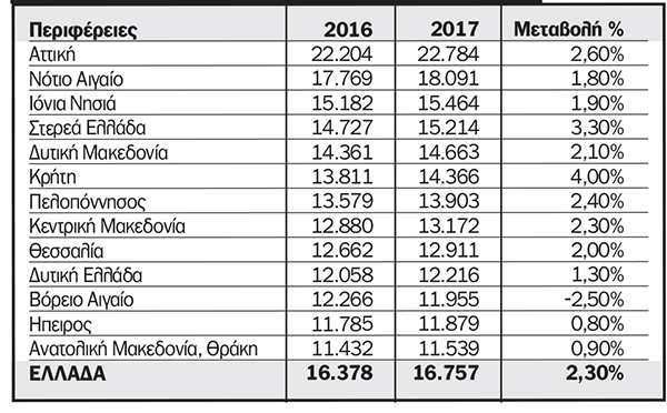 Τα συμπεράσματα αυτά εξάγονται από την πρώτη ανάγνωση των περιφερειακών λογαριασμών του 2017 που έδωσε χθες στη δημοσιότητα η Ελληνική Στατιστική Αρχή.