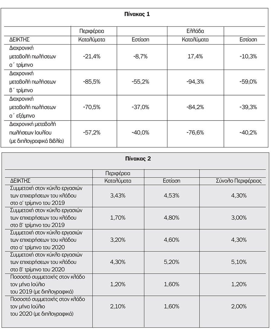 1) Η μείωση των πωλήσεων, όπως αναμενόταν, ήταν ιδιαίτερα μεγάλη το Α’ εξάμηνο (70,5% στα καταλύματα – 37% στην εστίαση), ωστόσο σε μικρότερα ποσοστά από εκείνα της χώρας, που ήταν αντίστοιχα 84,2% και 39,3%.