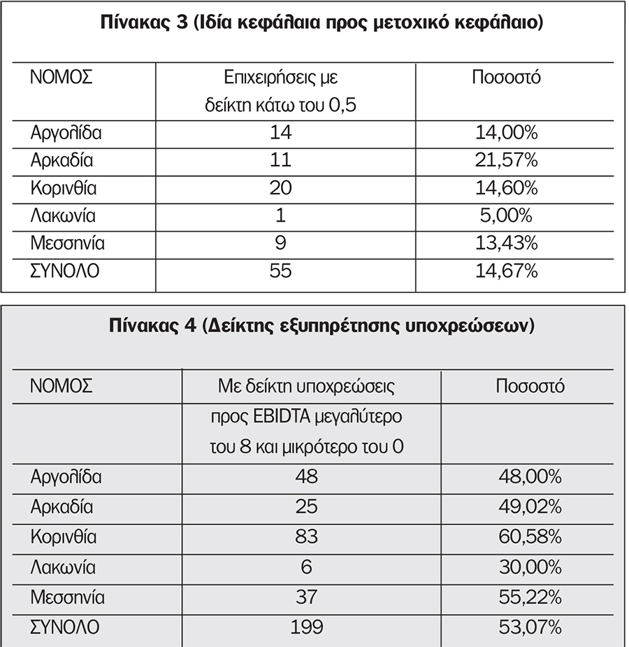 Στον πίνακα 3 που ακολουθεί, παρουσιάζεται η ανάλυση του δείγματος σε ό,τι αφορά το επίπεδο προβληματικότητας των επιχειρήσεων. Από την ανάγνωση του πίνακα προκύπτει ότι το μέσο ποσοστό προβληματικότητας των επιχειρήσεων περιφέρειας είναι 14,63%, με τη μεγαλύτερη τιμή να παίρνει ο Νομός Αρκαδίας και τη μικρότερη ο Νομός Λακωνίας.
