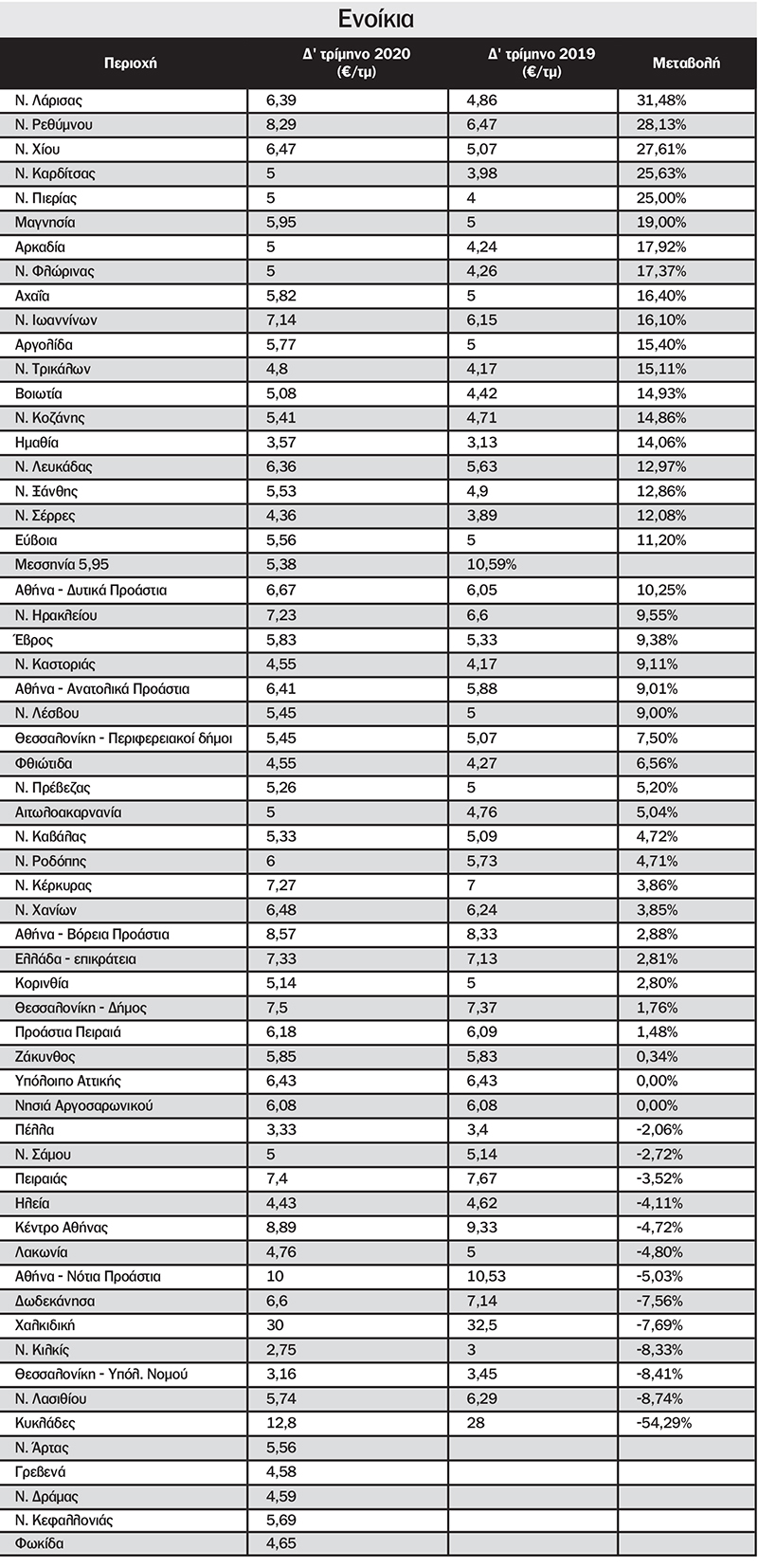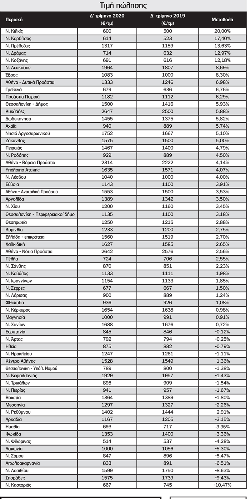 Το 2020, η μέση τιμή για τα σπίτια προς πώληση ήταν υψηλότερη στις Κυκλάδες, με 2.647 ευρώ ανά τ.μ., και χαμηλότερη στη Φλώρινα με 514 ευρώ ανά τετραγωνικό. Η μεγαλύτερη αύξηση σε σχέση με το προηγούμενο έτος, καταγράφηκε στο Κιλκίς (20%), ενώ η μεγαλύτερη μείωση στην Καστοριά με -10,5%. Όσο για τις ενοικιάσεις, η χαμηλότερη τιμή καταγράφεται στο Κιλκίς με 2,75€/τ.μ. και η υψηλότερη τιμή στη Χαλκιδική με 30€/τ.μ.