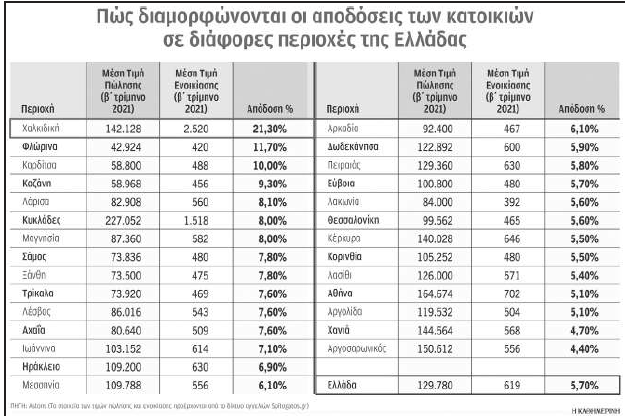 Σύμφωνα με την έρευνα στην Ελλάδα: «Πρωταθλήτρια των αποδόσεων εμφανίζεται η Χαλκιδική, με το εντυπωσιακό 21,3%. Συγκεκριμένα, η μέση τιμή πώλησης αγγίζει τα 142.128 ευρώ, ενώ η μέση τιμή ενοικίασης τα 2.520 ευρώ. Από τις δημοφιλείς τουριστικές περιοχές, ξεχωρίζει η αγορά κατοικίας των Κυκλάδων, όπου η μέση ετήσια απόδοση αγγίζει το 8%. Η μέση τιμή πώλησης φθάνει τα 227.052 ευρώ και η μέση τιμή ενοικίασης τα 1.518 ευρώ. Αντίστοιχα, στην Αθήνα, η μέση απόδοση δεν ξεπερνά το 5,1%, με τις τιμές πώλησης να ανέρχονται σε 164.674 ευρώ και το μέσο μηνιαίο κόστος ενοικίασης σε 702 ευρώ».
