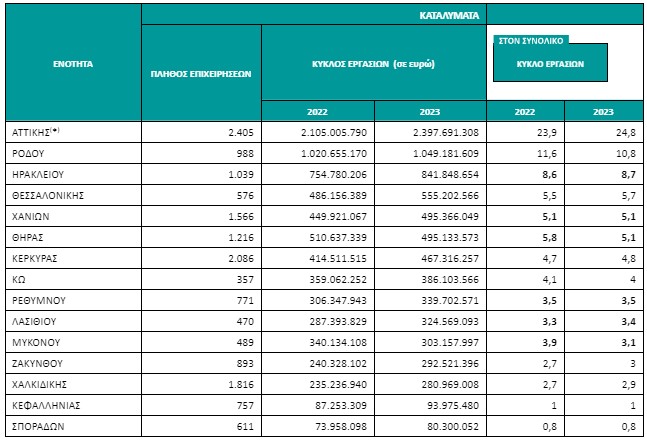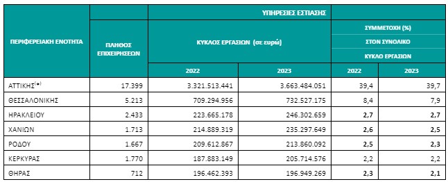 Για τις επιχειρήσεις του κλάδου των Υπηρεσιών Εστίασης των περιφερειακών ενοτήτων με συνεισφορά στον συνολικό κύκλο εργασιών έτους 2023 μεγαλύτερη από 1,0%, η μεγαλύτερη αύξηση στον κύκλο εργασιών μεταξύ των ετών 2023 και 2022 παρατηρήθηκε στις περιφερειακές ενότητες Κορινθίας (21,3%) και Ζακύνθου (21,0%), ενώ μείωση (2,9%) καταγράφηκε στην περιφερειακή ενότητα Μυκόνου Πανελλαδικά ο κύκλος εργασιών των επιχειρήσεων του κλάδου των Καταλυμάτων το έτος 2023 ανήλθε σε 9.683.582.528 ευρώ, σημειώνοντας αύξηση 10,1% σε σχέση με το έτος 2022, όπου είχε ανέλθει σε 8.793.103.758 ευρώ. Αντίστοιχα, ο κύκλος εργασιών των επιχειρήσεων του κλάδου της Εστίασης ανήλθε σε 9.227.995.765 ευρώ, σημειώνοντας αύξηση 9,6% σε σχέση με το έτος 2022, όπου είχε ανέλθει σε 8.421.363.364 ευρώ.