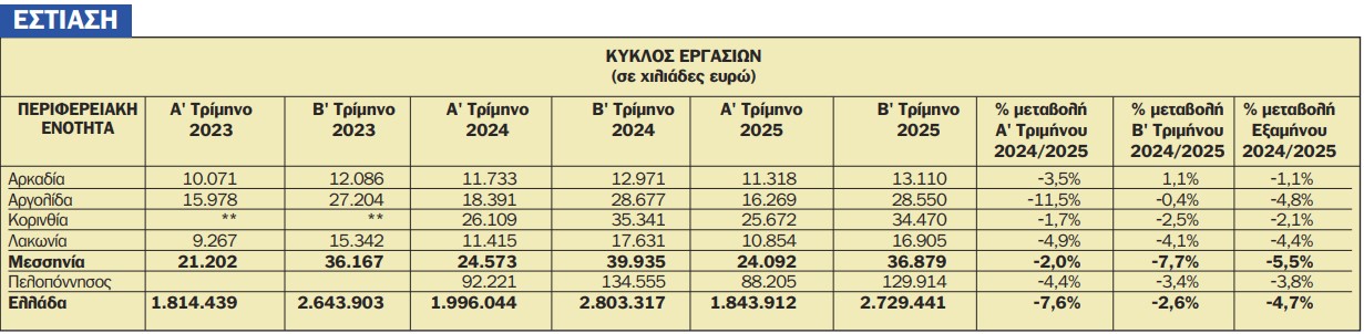 Τα έσοδα των επιχειρήσεων εστίασης, το φετινό δεύτερο τρίμηνο σε σχέση με το αντίστοιχο περσινό χρονικό διάστημα, μειώθηκαν κατά 7,7% στη Μεσσηνία, κατά 3,4% στην Περιφέρεια Πελοποννήσου και κατά 2,6% στην Ελλάδα. Συνολικά και σύμφωνα πάντα με τα στοιχεία της Ελληνικής Στατιστικής Αρχής (ΕΛΣΤΑΤ), το πρώτο φετινό εξάμηνο σε σχέση με το περσινό αντίστοιχο χρονικό διάστημα, τα έσοδα της εστίασης μειώθηκαν κατά 5,5% στη Μεσσηνία, κατά 3,8% στην Πελοποννήσου και κατά 4,7% στην Ελλάδα.