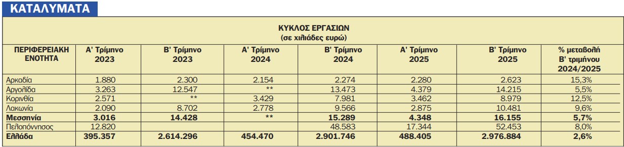 Σε αντίθεση με τη εστίαση ο τζίρος των καταλυμάτων, το Β’ φετινό τρίμηνο σε σχέση με το αντίστοιχο χρονικό διάστημα αυξήθηκε κατά 5,7% στη Μεσσηνία, κατά 8% στην Πελοπόννησο και κατά 2,6% στην Ελλάδα. Για το πρώτο τρίμηνο στη Μεσσηνία δεν έχουμε συγκρίσιμα στοιχεία και άρα δεν μπορούμε να εξάγουμε συμπεράσματα για το πρώτο εξάμηνο ούτε για το νομό ούτε για την Περιφέρεια Πελοποννήσου