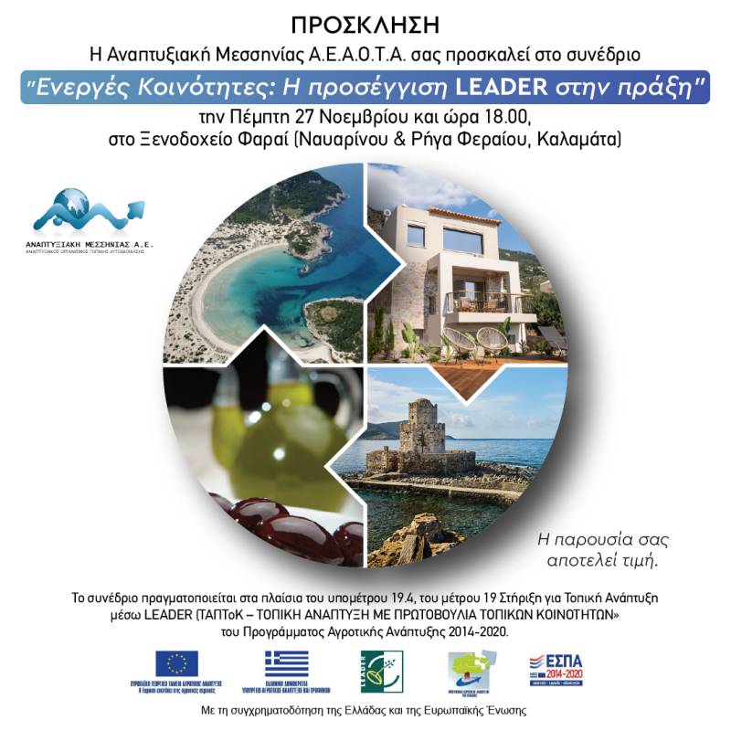 Γράφτηκε από την ΕΛΕΥΘΕΡΙΑ OnlineΣυνέδριο με θέμα «Ενεργές Κοινότητες: Η προσέγγιση leader στη Μεσσηνία» θα διοργανώσει την Πέμπτη 27 Νοεμβρίου στις 6 μ.μ. η Αναπτυξιακή Μεσσηνίας ΑΕ Α.ΟΤΑ στο ξενοδοχείο «Φαραί», ως Ομάδα Τοπικής Δράσης, για την εφαρμογή του προγράμματος CLLD/Leader 2014-2020.