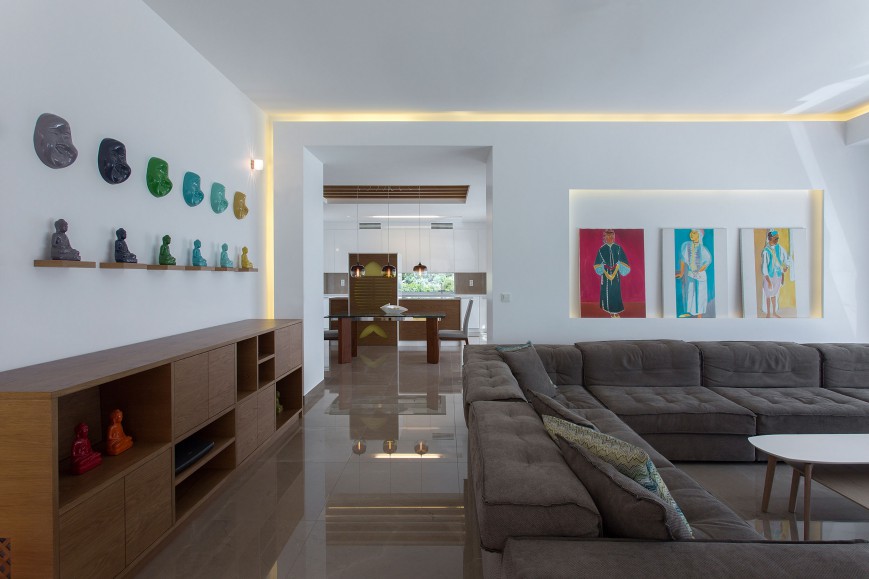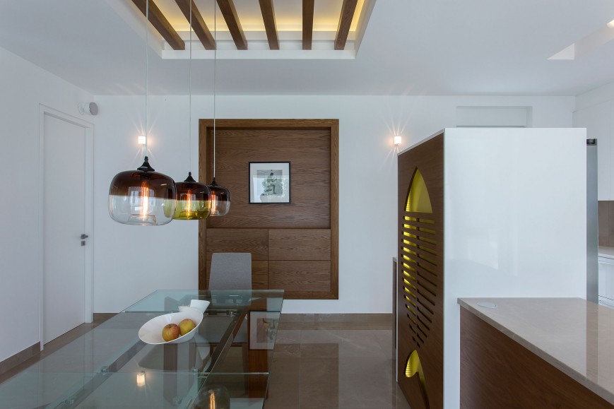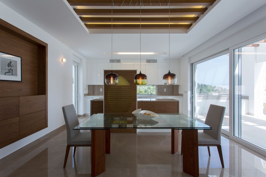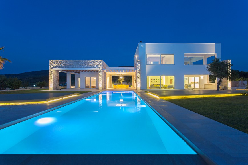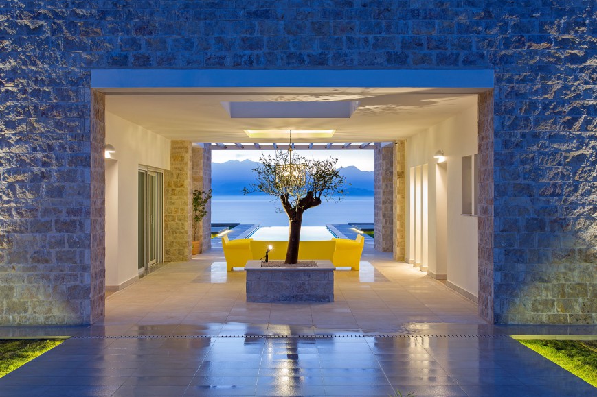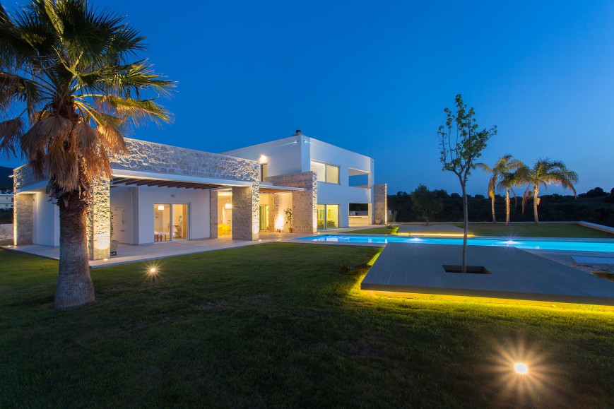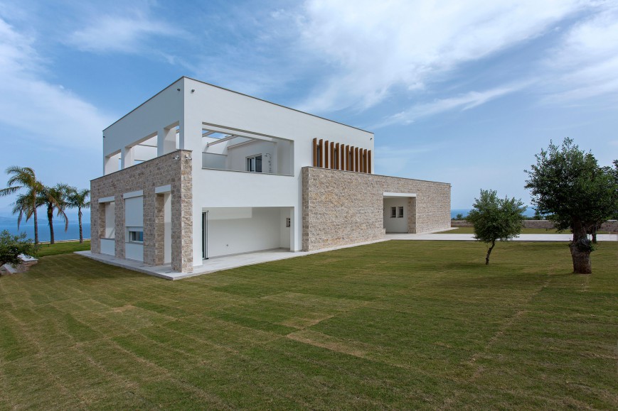 Αντίστοιχα στο κτίριο έχουν χρησιμοποιηθεί φυσικά υλικά της Πελοποννήσου, όπως μάρμαρο, πέτρα και ξύλο, ενώ στις τοιχοποιίες κυριαρχεί το απόλυτο λευκό που αντανακλά το φως και τονίζει τις αντιθέσεις των υλικών.Τα μεγάλα ανοίγματα στο ισόγειο και τον όροφο διατηρούν την αίσθηση του ανοιχτού χώρου και σε όλο το εσωτερικό της κατοικίας. Έπρεπε όμως η κατοικία, να λειτουργεί σαν ελβετικό ρολόι! Να προσφέρει ευχάριστη και άνετη διαμονή στους μόνιμους κάτοικους, αλλά να υποδέχεται και να φιλοξενεί με σεβασμό τα μέλη της οικογένειάς τους και τους φίλους τους που τους επισκέπτονται τακτικά.