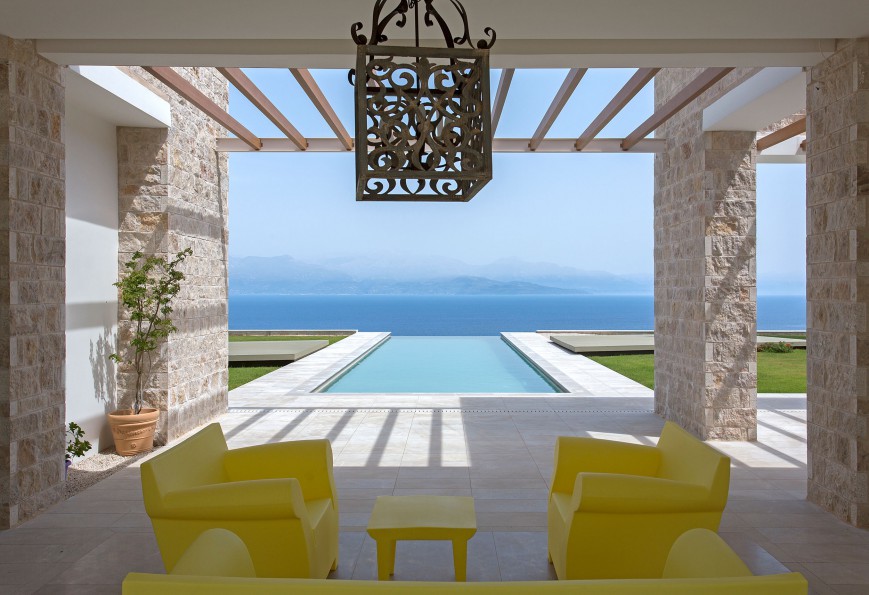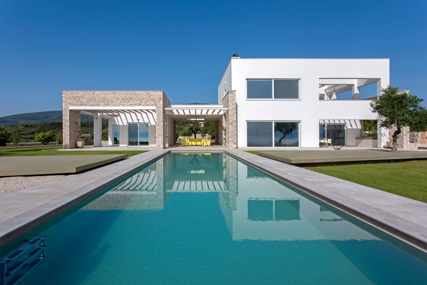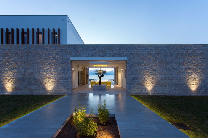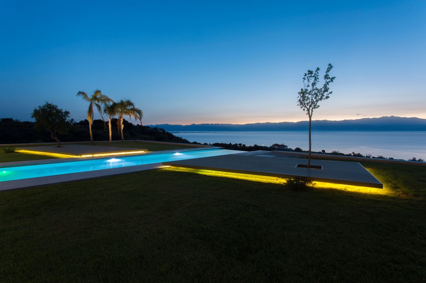 Έτσι, το κτίριο αποτελείται από δύο όγκους, την κύρια κατοικία και τον ξενώνα, οι οποίοι συνδέονται μέσω ενός ημιυπαίθριου χώρου (patio). Το patio αποτελεί χώρο καθιστικού για τους καλοκαιρινούς μήνες. Στη συνέχεια αυτού του χώρου έχει τοποθετηθεί η μεγάλου μήκους πισίνα. Το κτίριο έχει χωροθετηθεί με τέτοιο τρόπο, ώστε κατά την είσοδο σε αυτό να καδράρεται η (infinite pool) πισίνα, μία λωρίδα θάλασσας και η πυραμίδα του Ταϋγέτου στο βάθος. Η αρμονική αυτή αλληλουχία τονίζεται και με την κατάλληλη χρήση των υλικών. Το ίδιο μάρμαρο έχει επενδύσει γραμμικά την "πλατεία" πριν την είσοδο και το patio, ενώ στη συνέχεια εισχωρεί στην πισίνα καταλήγοντας σε καταρράκτη στο τελείωμα της προς το μέρος της θάλασσας. Η κύρια κατοικία αποτελείται από δύο ορόφους με τους καθημερινούς χώρους στο ισόγειο και ένα άνετο υπνοδωμάτιο στον όροφο.