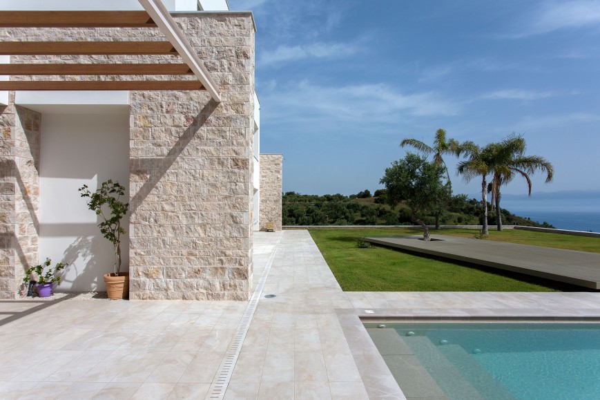 Μία από τις πιο έντονες επιθυμίες των πελατών, ήταν να χρησιμοποιηθούν τοπικά φυσικά υλικά. Πέρα από μία σειρά δομικών υλικών που επιλέχθηκαν για αυτό το λόγο, το μάρμαρο που εξάγεται στο Λυγουριό Αργολίδας από την ΜΑΡΜΥΚ Ηλιόπουλος, κατέχει περίοπτη θέση στο συγκεκριμένο έργο και συναντάται σε πλήθος διαφορετικών στοιχείων και με πολύ διαφορετική επεξεργασία. Σφυρηλατημένο σαν πέτρα, καλύπτει μεγάλο μέρος της όψης του κτιρίου. Όλα τα δάπεδα, έχουν καλυφθεί από πλάκες μεγάλων διαστάσεων γυαλισμένες ή matte. Σε μέγεθος ψηφίδας ντύνουν τους τοίχους των λουτρών, ενώ με τραχιά επιφάνεια καλύπτουν όλα τα εξωτερικά δάπεδα. Το ίδιο μάρμαρο θα δει και αυτός που θα ανοίξει τα μάτια του μέσα στη πισίνα, να καλύπτει την σκάλα αλλά και τον καταρράκτη.