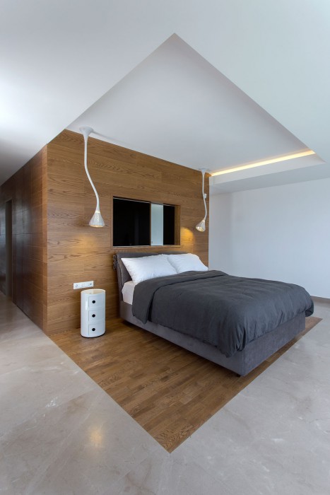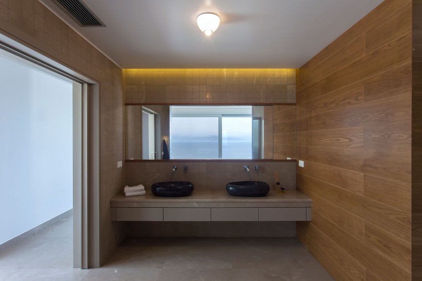 Το λουτρό εντός του υπνοδωματίου μοιάζει με έναν ξύλινο κύβο που έχει τοποθετηθεί κεντρικά στο υπνοδωμάτιο. Ένα τμήμα του κύβου εμφανίζεται στο ισόγειο πλευρικά της σκάλας που ανεβαίνει προς τον όροφο. Σκοπός αυτής της χωροθέτησης ήταν, εκτός από την ανεμπόδιστη θέα από την κρεβατοκάμαρα, οι κάτοικοι να μπορούν να απολαύσουν τη μαγευτική θέα και από το χώρο του λουτρού.