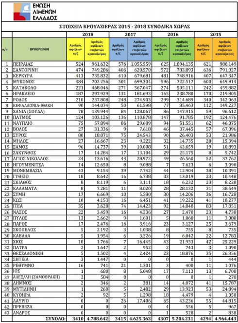 Τα στοιχεία για τις αφίξεις κρουαζιερόπλοιων και επιβατών σε 43 λιμάνια της Ελλάδας παρουσιάζονται στον πίνακα της Ενωσης Λιμένων Ελλάδος.