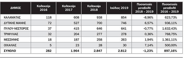 Αναλυτικά τα στοιχεία της AirDNA για τους μεσσηνιακούς δήμους παρουσιάζονται στον πίνακα.