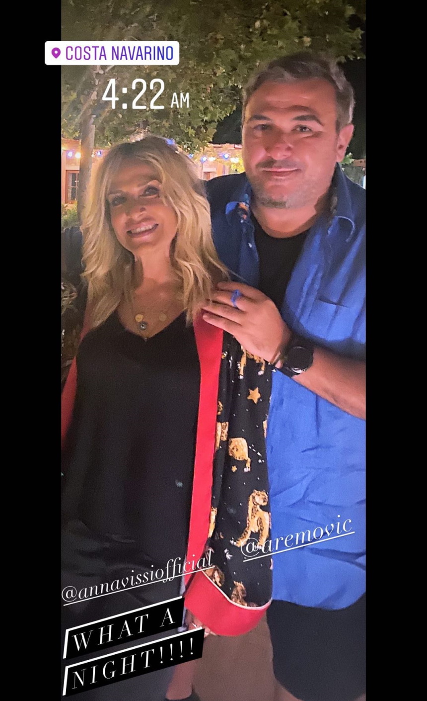 Στην Costa Navarino μάλιστα, είχαν την ευκαιρία να συναντήσουν και την Άννα Βίσση. Το γνωστό ζευγάρι δείπνησε το βράδυ του Σαββάτου με την Ελληνίδα σταρ αλλά και με την παρέα του. Ανάμεσα τους ήταν ο Κώστας Πηλαδάκης με τη σύντροφό του Ναυσικά Παναγιωτακοπούλου, ο Χάρης Σιανίδης, ο Νίκος Γεωργιάδης και η Σοφία Καρβέλα.