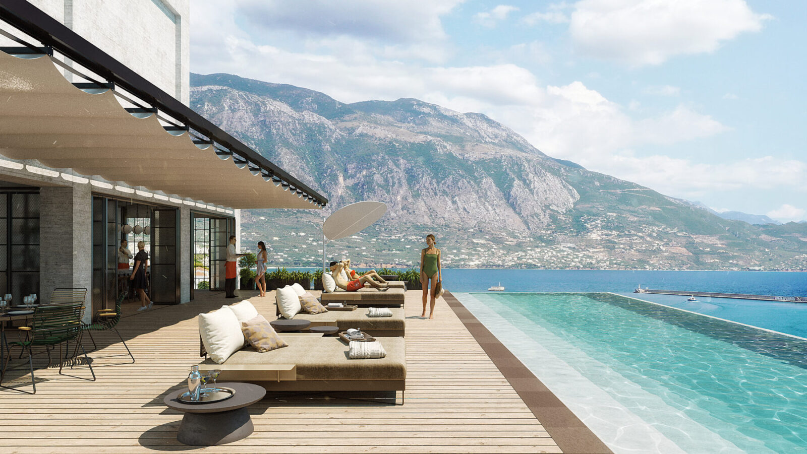 Και στα δυο ξενοδοχεία, το ισόγειο θα απαρτίζεται από τον χώρο της εισόδου, κουζίνες και χώρους εστίασης καθώς και γραφεία προσωπικού. Στον πέμπτο όροφο του πεντάστερου ξενοδοχείου δημιουργούμε εστιατόριο και μια πισίνα υπερχείλισης (infinity edge), όπου οι επισκέπτες μπορούν να απολαύσουν τη θέα στον Μεσσηνιακό κόλπο και τον Ταΰγετο.