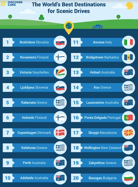 Η ιστοσελίδα ενοικίασης αυτοκινήτων ρώτησε περισσότερους από 150.000 ταξιδιώτες σε κάθε γωνιά του πλανήτη για τις εμπειρίες τους, φτιάχνοντας μια λίστα με τους 20 καλύτερους προορισμούς παγκοσμίως για γραφικές διαδρομές με αυτοκίνητο. Οπως και πέρυσι, η Καλαμάτα βρέθηκε στην πέμπτη θέση, ενώ ακολουθούν η Κεφαλλονιά στην όγδοη θέση, η Κως στην 14η θέση και η Ζάκυνθος στην 19η θέση, σε μια επανάληψη ουσιαστικά της περσινής κατάταξης, καθώς δεν παρατηρήθηκαν αλλαγές. Για την Καλαμάτα, η οποία συγκέντρωσε βαθμολογία 9,1/10, το DiscoverCars.com αναφέρει πως η Μεσσηνιακή πρωτεύουσα έχει πολλά να προσφέρει στους ταξιδιώτες που θέλουν να κάνουν γραφικές διαδρομές με το αυτοκίνητο. Οπως τονίζει, πλησίον της οι επισκέπτες θα ανακαλύψουν εντυπωσιακά ορεινά τοπία και γραφικά παραθαλάσσια χωριά. Ακόμα, το άρθρο προτείνει μια εκδρομή στην Αρχαία Μεσσήνη.