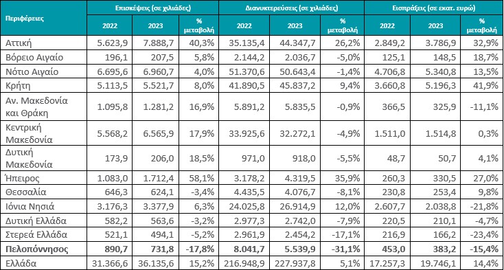 έσοδα μειώθηκε από 2,62% το 2022 σε 1,94% το 2023. Οι ταξιδιωτικές δαπάνες των Γερμανών στην Περιφέρεια Πελοποννήσου μειωθήκαν πέρυσι σε σχέση με πρόπερσι κατά 46,4%, των Βρετανών κατά 44,3% και των Γάλλων κατά 34,2%. Στην Κρήτη τα ταξιδιωτικά έσοδα αυξήθηκαν πέρυσι κατά 41,9% (αύξηση 1,5 δισ. ευρώ), στην Αττική 32,9 % (αύξηση 932 εκ. ευρώ) και στην Ήπειρο 27% (αύξηση 70,2 εκ. ευρώ. Στον αντίποδα η μείωση των ταξιδιωτικών εισπράξεων άγγιξε το 23 ,4% στη Στερεά και το 21,8% στα Ιόνια Νησιά.