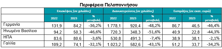 Πιο ανησυχητική, σε βαθμό κόκκινου συναγερμού, είναι η μείωση κατά 31,1% των διανυκτερεύσεων αλλοδαπών επισκεπτών που οφείλεται κυρίως στην μείωση των διανυκτερεύσεων επισκεπτών από το Ηνωμένο Βασίλειο κατά 51,6%, από τη Γερμανία κατά 48,4% και από τη Γαλλία κατά 43,4%. Μειωμένος φυσικά κατά 17,8% έναντι πανελλαδικής αύξησης 15,2% ήταν και ο αριθμός των επισκέψεων στην Περιφέρεια Πελοποννήσου το 2023 σε σχέση με το 2022.