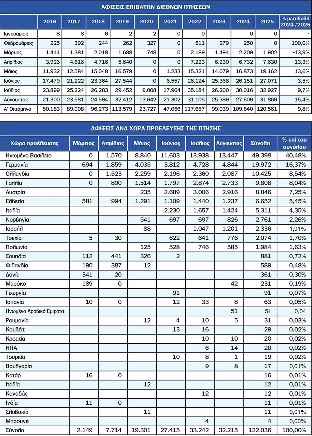 Από τις συνολικές αφίξεις διεθνών πτήσεων το 40,8% είναι από το Ηνωμένο Βασίλειο, το 16,3% από τη Γερμανία και το 8,54% από την Ολλανδία.