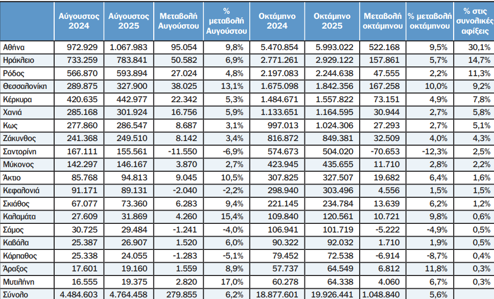 Σε εθνικό επίπεδο, οι διεθνείς αεροπορικές αφίξεις συνεχίζουν να κινούνται ανοδικά. Κατά το πρώτο οκτάμηνο του 2025, καταγράφηκαν συνολικά 19,93 εκατ. αφίξεις, σημειώνοντας αύξηση +5,6% σε σχέση με το 2024.