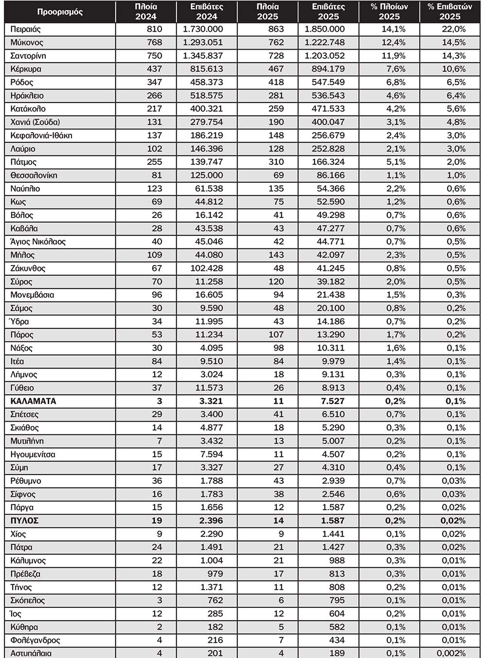 Σε εθνικό επίπεδο, την πρώτη τριάδα διατηρούν οι μεγάλοι προορισμοί. Ο Πειραιάς βρίσκεται στην κορυφή με 863 αφίξεις και 1.850.000 επιβάτες, αυξημένους σε σχέση με το 2024. Η Μύκονος ακολουθεί με 762 αφίξεις και 1.222.748 επιβάτες, παρουσιάζοντας μικρή υποχώρηση, ενώ η Σαντορίνη καταγράφει 728 αφίξεις και 1.203.052 επιβάτες, επίσης μειωμένους σε σχέση με το προηγούμενο έτος .