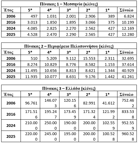Σύμφωνα με τα στοιχεία το Ξενοδοχειακού Επιμελητηρίου Ελλάδας στη Μεσσηνία την περίοδο 2006–2016 καταγράφεται αύξηση 49,5%, ενώ την περίοδο 2016–2024 η άνοδος περιορίζεται στο 19,3%. Η ουσιαστική αλλαγή εντοπίζεται στην τελευταία διετία. Από το 2024 στο 2025 η αύξηση περιορίζεται σε μόλις 111 κλίνες ή 0,9%.