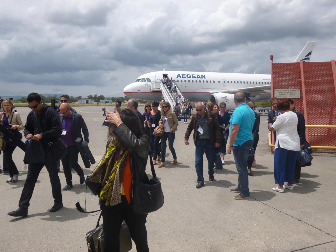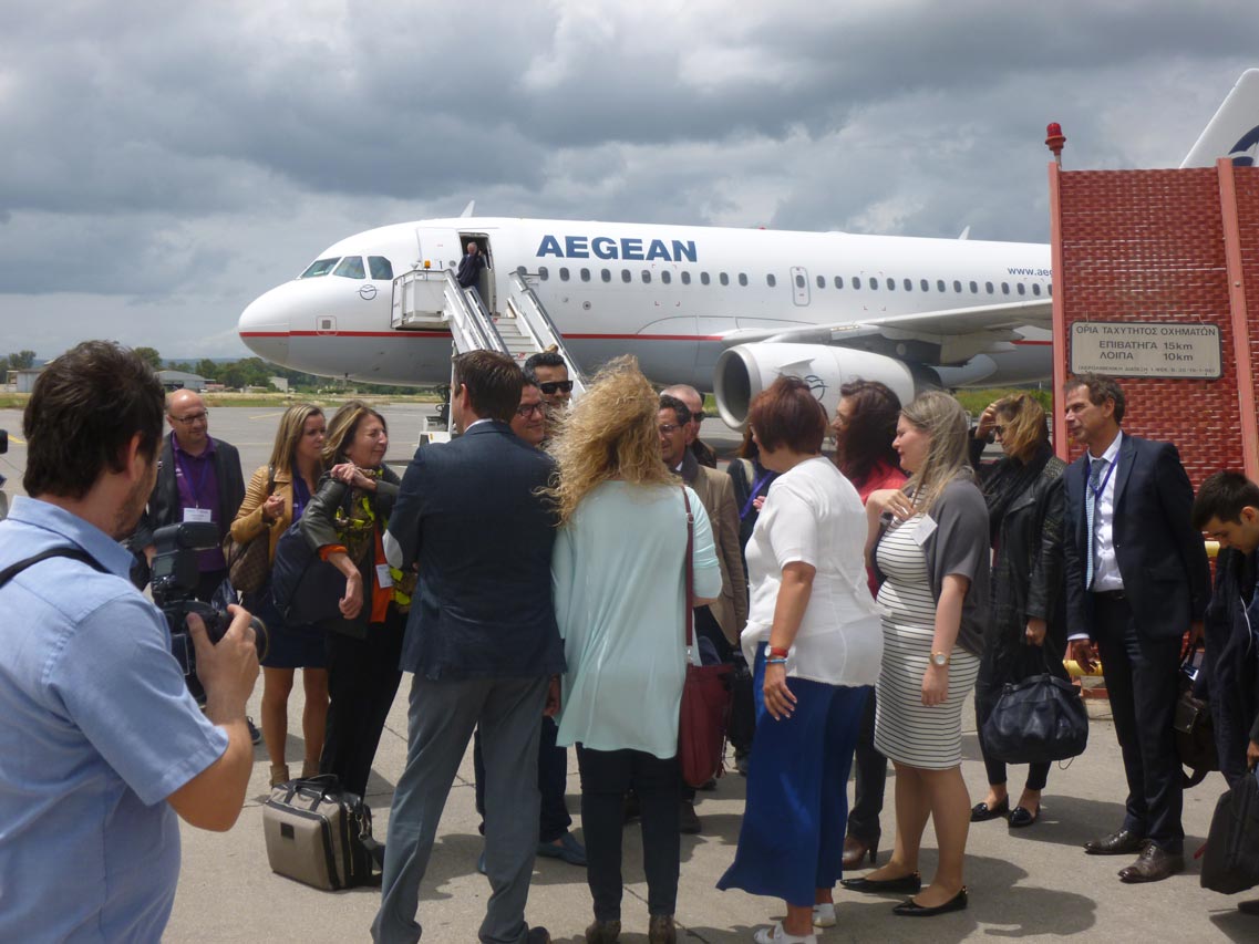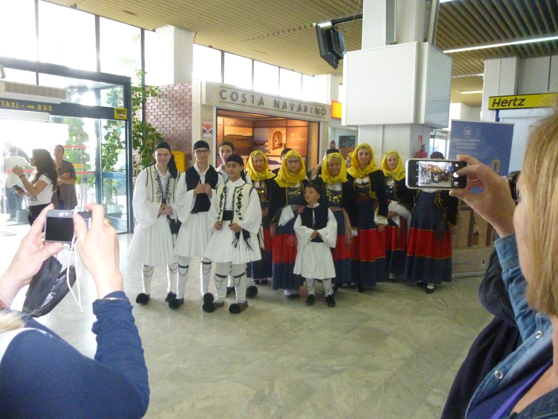 Ηρθαν στο αεροδρόμιο της Καλαμάτας με απευθείας πτήση της Aegean από το Παρίσι. Τους υποδέχθηκαν ο περιφερειάρχης Πέτρος Τατούλης, οι αντιπεριφερειάρχες Ντίνα Νικολάκου και Περικλής Μαντάς και αντιπροσωπεία του Δήμου Καλαμάτας με επικεφαλής την πρόεδρο της Επιτροπής Τουρισμού Παναγιώτα Ντίντα και τον αντιδήμαρχο Δημήτρη Βεργόπουλο.