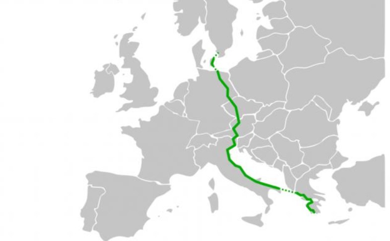Ειδικότερα, από Βορρά προς Νότο, η διαδρομή ξεκινά με τη θαλάσσια οδό Χέλσινγκμποργκ (Σουηδία) – Χέλσινγκορ (Δανία). Συνεχίζει οδικώς έως την πόλη Γκέντσερ και από εκεί φτάνει στο Ροστόκ της Γερμανίας με καράβι. Από τη Γερμανία η διαδρομή συνεχίζει οδικώς προς Τσεχία και μετά προς Αυστρία, για να πάρει σειρά η Ιταλία. Η τελευταία συνδέεται με την Ελλάδα μέσω της θαλάσσιας οδού Μπρίντιζι – Ηγουμενίτσας για να ακολουθήσει η οδική σύνδεση του λιμανιού της Θεσπρωτίας με την Καλαμάτα.