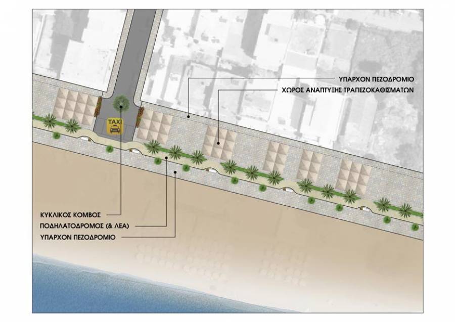 Ετσι λοιπόν, κατά τη γνώμη μας δεν τίθεται ανάγκη πεζοδρόμησης του τμήματος από το λιμένα έως την Ηρώων. Το οδικό δίκτυο είναι φορτωμένο, ενώ υπάρχει πλατύ πεζοδρόμιο που εξυπηρετεί πεζούς και ποδηλάτες. Προτείνουμε την πεζοδρόμηση της Ναυαρίνου από την Ηρώων έως την Κρήτης, που αποτελεί τμήμα με μεγάλη επισκεψιμότητα λουομένων και εκτενή αμμουδιά. Τα υπάρχοντα πεζοδρόμια διατηρούνται και ο ενδιάμεσος χώρος αποδίδεται στην ανάπτυξη τραπεζοκαθισμάτων και στη διάνοιξη ποδηλατοδρόμου και ζωνών πρασίνου. Ο ποδηλατόδρομος έχει επαρκές πλάτος ώστε να δύναται να εξυπηρετήσει τη διέλευση οχημάτων εκτάκτου ανάγκης (π.χ. ασθενοφόρο) αλλά και οχημάτων τροφοδοσίας καταστημάτων σε συγκεκριμένες πρωινές ώρες.