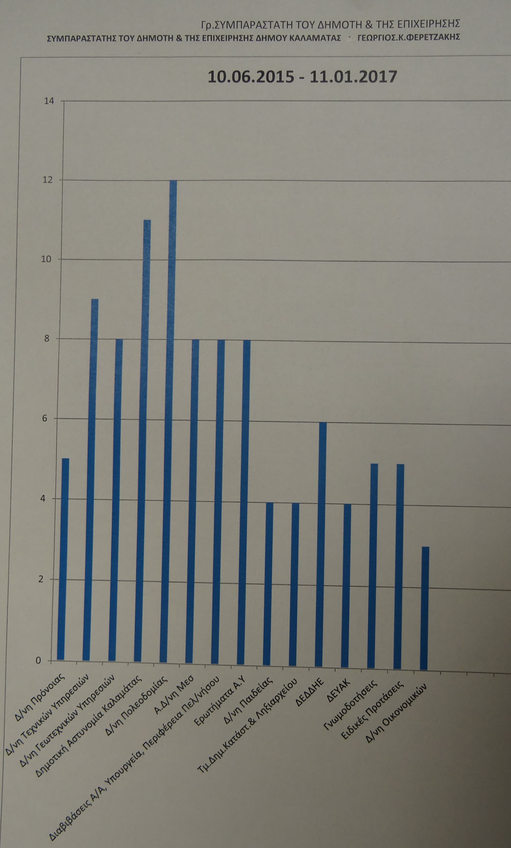 “Η δική μου θητεία ξεκίνησε στις 10 Μαΐου 2015. Μέχρι τις 11 Ιανουαρίου 2017, από τις υποθέσεις που έφθασαν στο γραφείο μου αφορούσαν, το 12% τη Διεύθυνση Πολεοδομίας, το 11% τη Δημοτική Αστυνομία, το 9% τη Διεύθυνση Τεχνικών Υπηρεσιών, από 8% για κάθε μία από την Αστυνομική Διεύθυνση Μεσσηνίας και τη Διεύθυνση Γεωτεχνικών Υπηρεσιών, το 6% τον ΔΕΔΔΗΕ, το 5% τη Διεύθυνση Πρόνοιας, από 4% τη Διεύθυνση Παιδείας και τη ΔΕΥΑΚ, το 3% τη Διεύθυνση Οικονομικών, ενώ 8% των αναφορών διαβιβάστηκαν προς τις ανεξάρτητες αρχές (Συνήγορο Καταναλωτή, Ρυθμιστική Αρχή Ενέργειας, υπουργεία, Περιφέρεια Πελοποννήσου), ένα ακόμα 8% αφορούσε ερωτήματα προς τα αρμόδια υπουργεία. Τέλος, ένα 5% αφορούσαν γνωμοδοτήσεις και ένα άλλο 5% ειδικές προτάσεις που έγιναν από το γραφείο μας για υποθέσεις διαφόρων ειδών. Θα πρέπει να σημειώσω ότι η ανταπόκριση του γραφείου υπήρξε άμεση, παρά το γεγονός ότι το προσωπικό είναι ελάχιστο”.