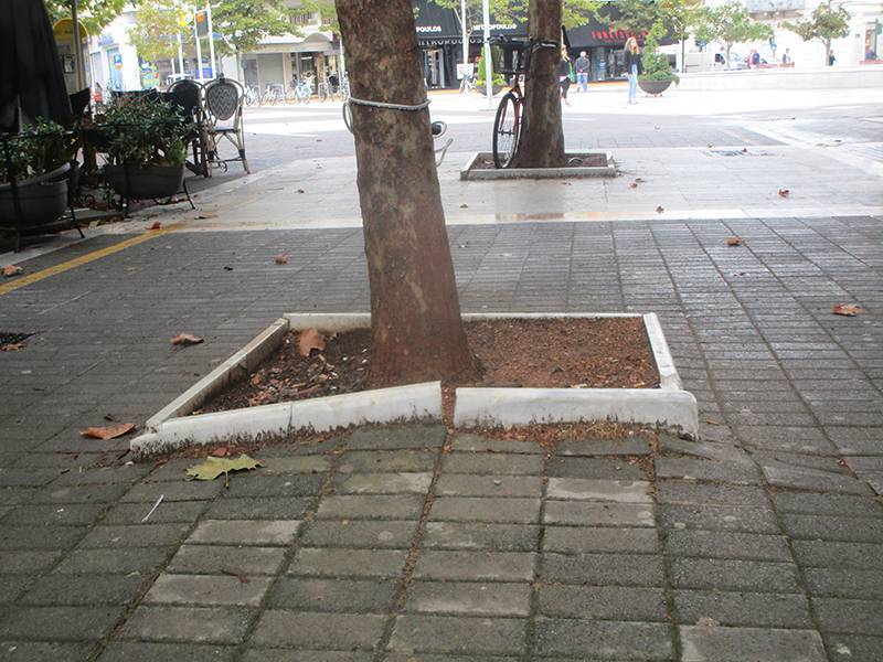 Φυσικά, όπου υπάρχει πρόβλημα με τις ρίζες και τη μετατόπιση πλακών πεζοδρομίου ή κυβολίθων προς τα άνω, θα υπάρξει σχετική παρέμβαση διευθέτησης, με κατάλληλο τεχνικώς τρόπο, ώστε να εξασφαλίζεται και ικανοποιητικό αισθητικό αποτέλεσμα, όπως συνέβη πριν από μερικούς μήνες στην οδό Σιδηροδρομικού Σταθμού (ανατολικό πεζοδρόμιο)».