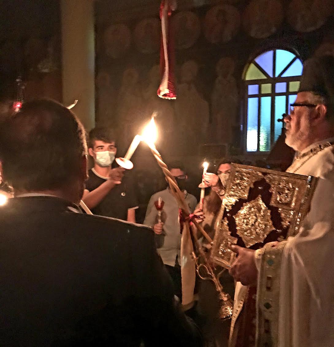 Δεκάδες πιστοί, τηρουμένων των υγειονομικών μέτρων, συμμετείχαν στην Ιερά Ακολουθία, αναφωνώντας το «Χριστός Ανέστη» και ανταλλάσσοντας ευχές για υγεία και ομόνοια.
