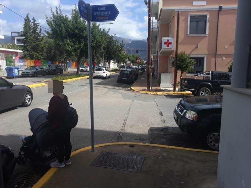 Συνεχίζοντας στο ίδιο πεζοδρόμιο μετά τη Φαρών, στην επόμενη διασταύρωση στη Βύρωνος (φωτό 2) δεν φτιάχτηκε διάβαση για τα ΑμεΑ, οπότε η κίνησή τους διακόπτεται, σταματάει. Πάντως, όπως φαίνεται, με δυσκολία κινούνται και τα καροτσάκια με τα μωρά.
