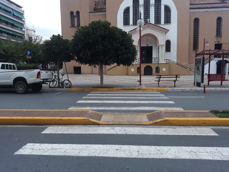 Κλείνοντας το φωτορεπορτάζ μας επιστρέφουμε πιο κεντρικά, στην πολύπαθη διάβαση πεζών και ΑμεΑ επί της Βασ. Γεωργίου, μπροστά από την εκκλησία και την πλατεία των Ταξιαρχών (φωτό 5). Για την ακρίβεια, πρώτα απ’ όλα είναι διάβαση-πέρασμα για μηχανάκια. Και τα ΑμεΑ, αν καταφέρουν να περάσουν τη διάβαση στη νησίδα, θα μείνουν στη μέση του δρόμου, στο ρεύμα προς την κεντρική πλατεία, καθώς εδώ και χρόνια δεν έχει δημιουργηθεί διάβαση για να ανέβουν στην πλατεία Ταξιαρχών.