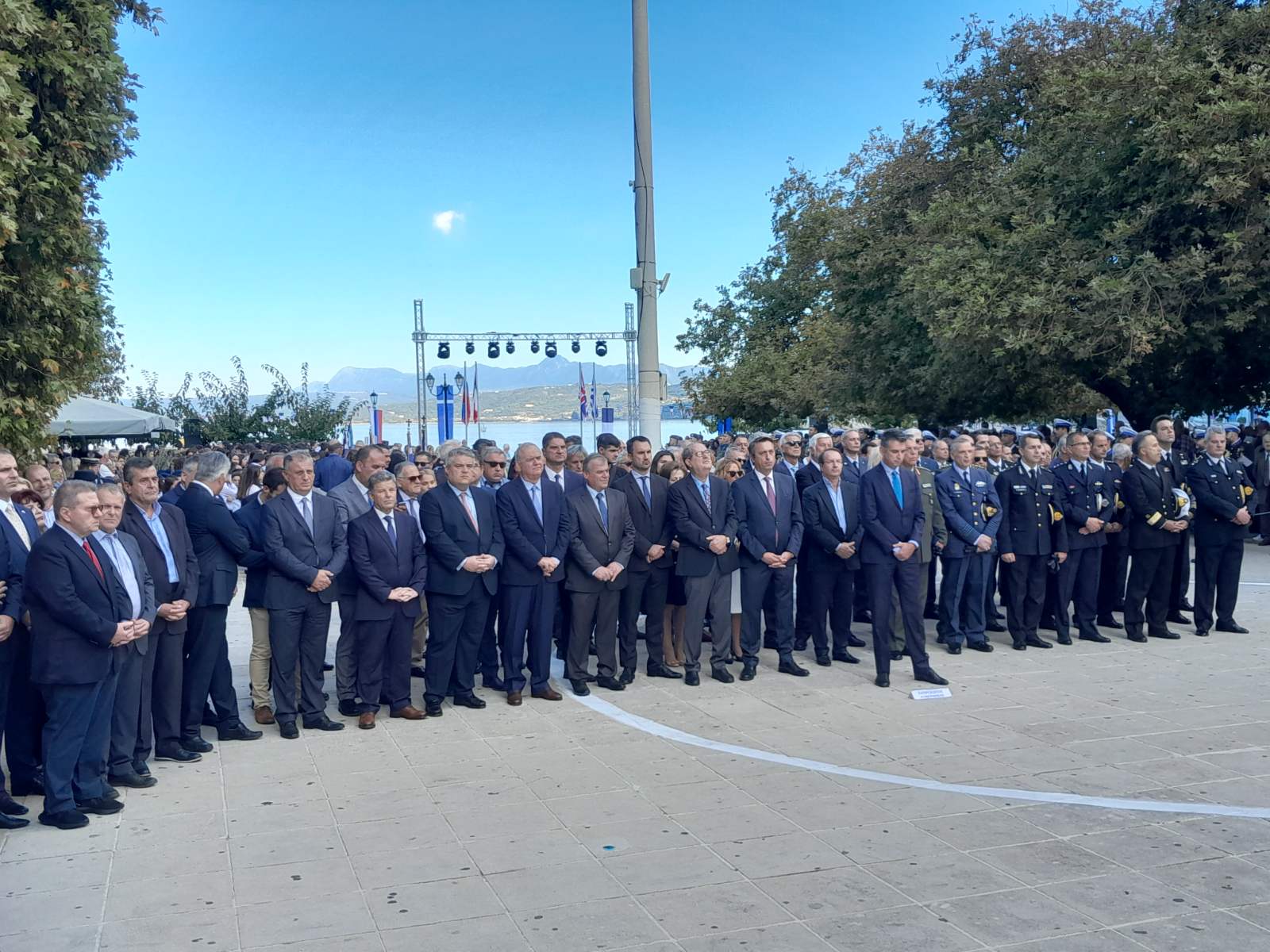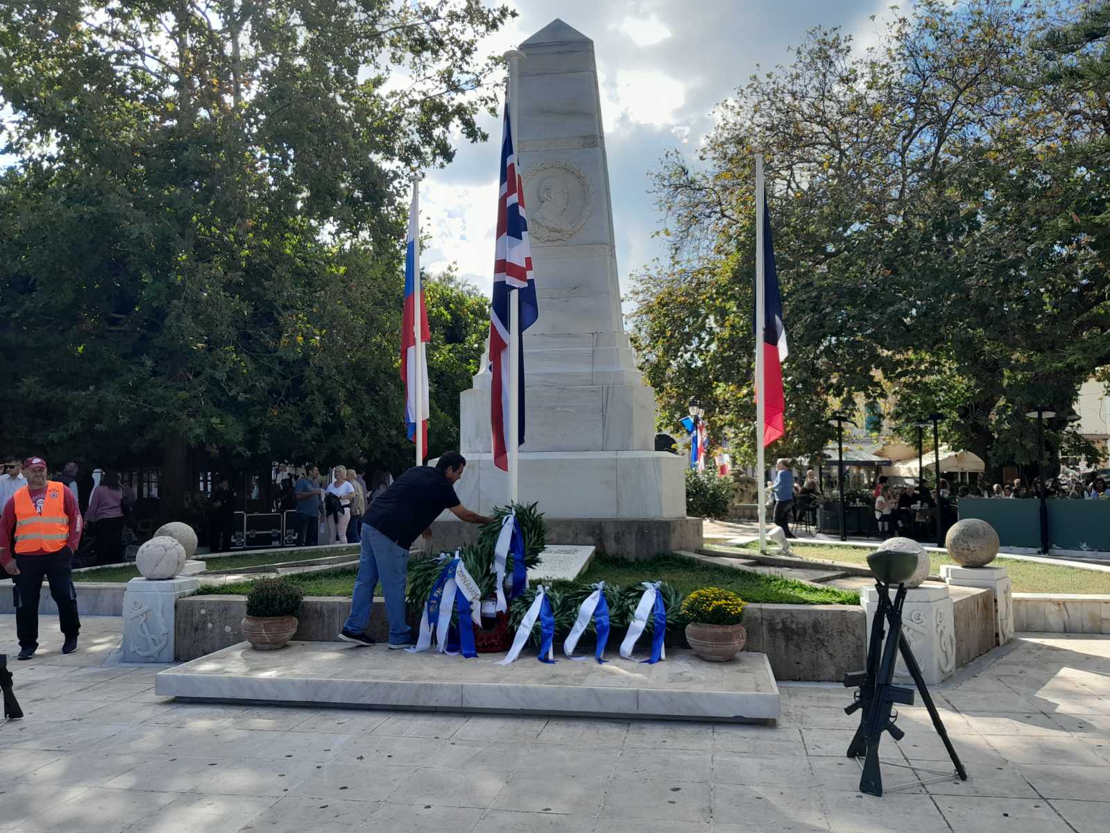 Μετά τη δοξολογία χοροστατούντος του Μητροπολίτη Μεσσηνίας Χρυσόστομου και την επιμνημόσυνη δέηση ακολούθησε κατάθεση σταφάνων από τον Γενικό Γραμματέα Δημοσίων Επενδύσεων και ΕΣΠΑ Δημήτρη Σκάλκο εκ μέρους της κυβέρνησης, τον βουλευτή Περικλή Μαντά εκ μέρους της Βουλής των Ελλήνων, τον εκπρόσωπο της διοίκησης της πρεσβείας του Ηνωμένου Βασιλείου Γιώργο Γιάνναρη, τον επίτιμο πρόξενο της Γαλλίας Αριστείδη Μουτζούρη, ενώ το στεφάνι της Ρωσικής Ομοσπονδίας κατέθεσε ο δήμαρχος Πύλου - Νέστορος Παναγιώτης Καρβέλας. Στεφάνια επίσης κατέθεσαν ο περιφερειάρχης Πελοποννήσου Παναγιώτης Νίκας και ο διοικητής της ΙV Μεραρχίας Πεζικού υποστράτηγος Δημήτριος Σκουφίδης.