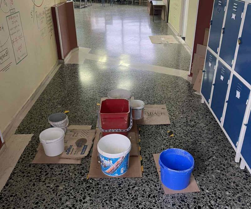 5ο Λύκειο: εκτεταμένες διαρροές και υγρασίες στο σχολείο, όπου είναι γεμάτο με κουβάδες. 3ο Γυμνάσιο: διαρροές και υγρασίες. 12ο Δημοτικό: εκτεταμένες διαρροές και ρωγμές από το φούσκωμα στους φωταγωγούς. Το σχολείο είναι με κουβάδες. Η είσοδος του σχολείου είναι γεμάτη λιμνασμένα νερά. 19ο Δημοτικό: η διεύθυνση ενημέρωσε τους γονείς να έχουν τα παιδιά μαζί τους μπουκαλάκι με νερό, γιατί το νερό από τις βρύσες δεν είναι πόσιμο.